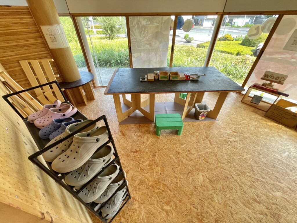 左奥のブルーシートがあるところが粘土で遊ぶゾーン。