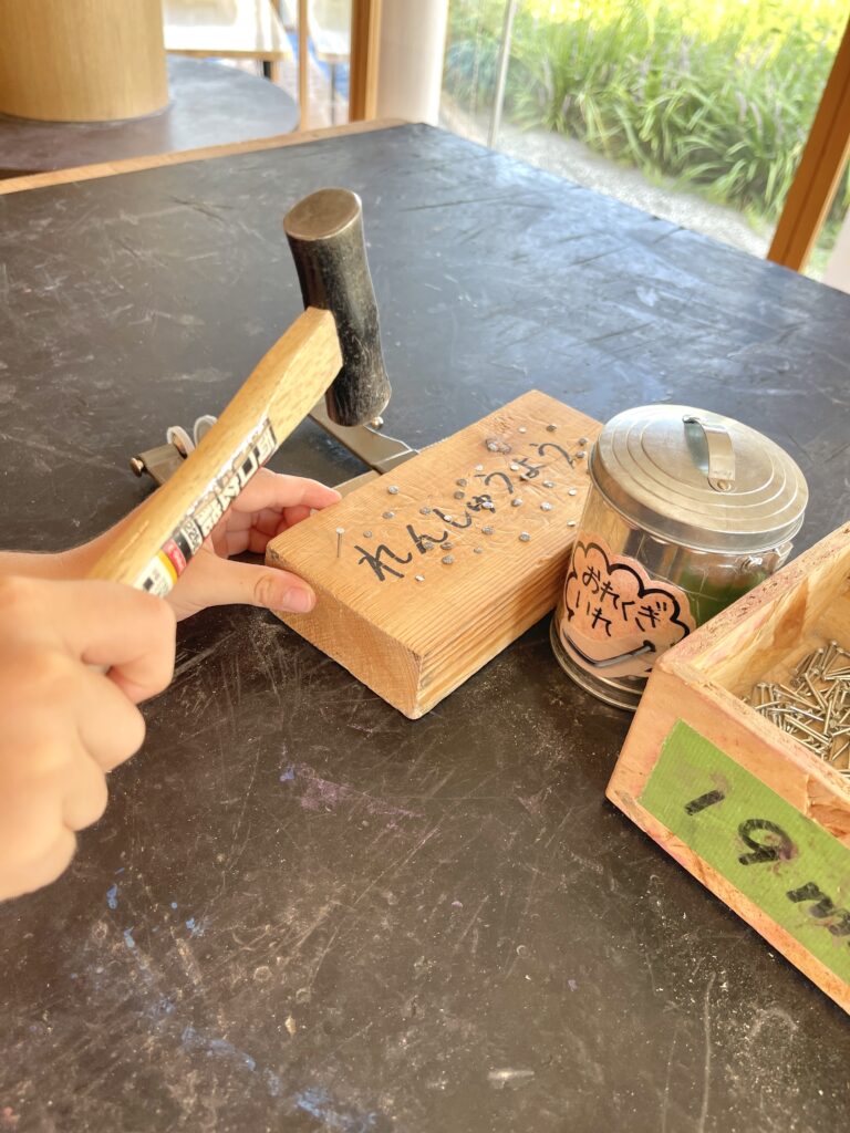 練習用の木材で釘を試し打ちしましたが、かなり硬くてママからナンシーにバトンタッチ!