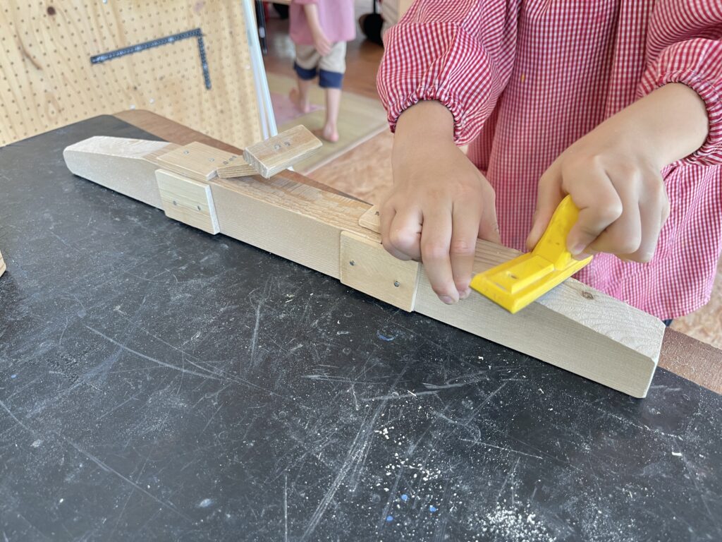 木工で作成した作品に色を塗ります。