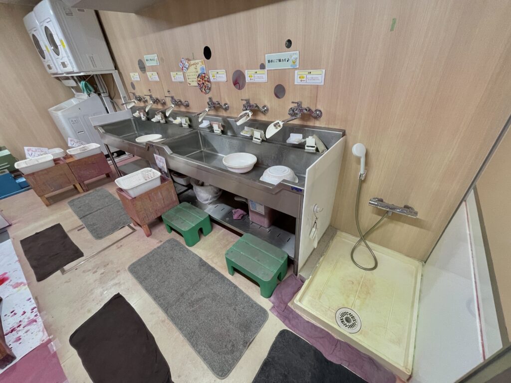 アクリル板のあるアトリエ付近に流し台とシャワーが設置されています。