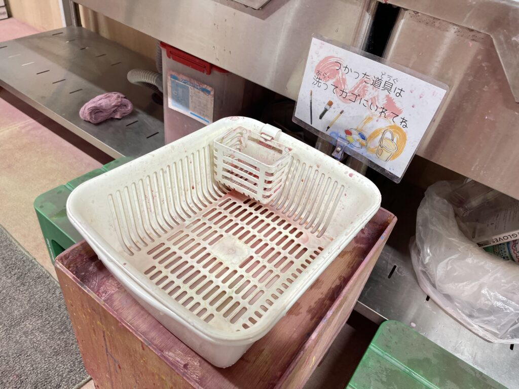 パレット・筆・筆洗いはここでセルフで洗うシステムです。