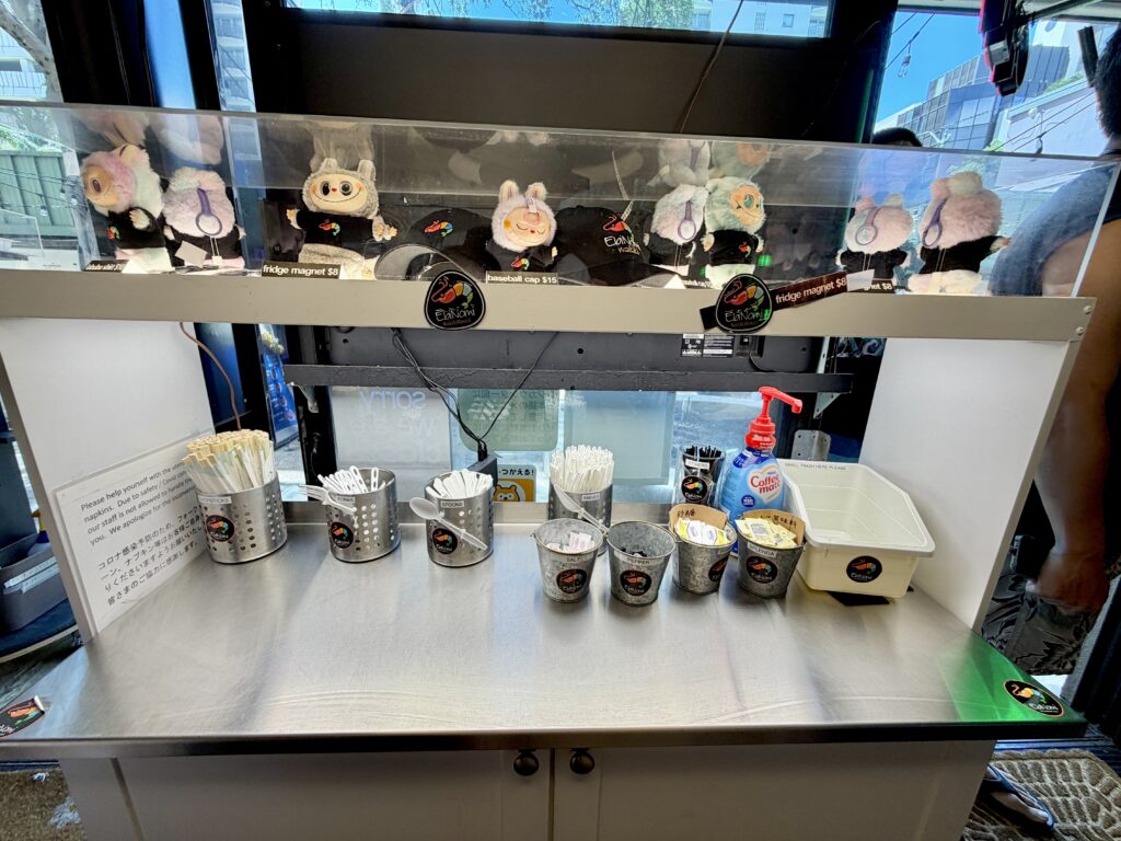 カウンターの反対側にはテイクアウト用の調味料&カトラリーがあります。