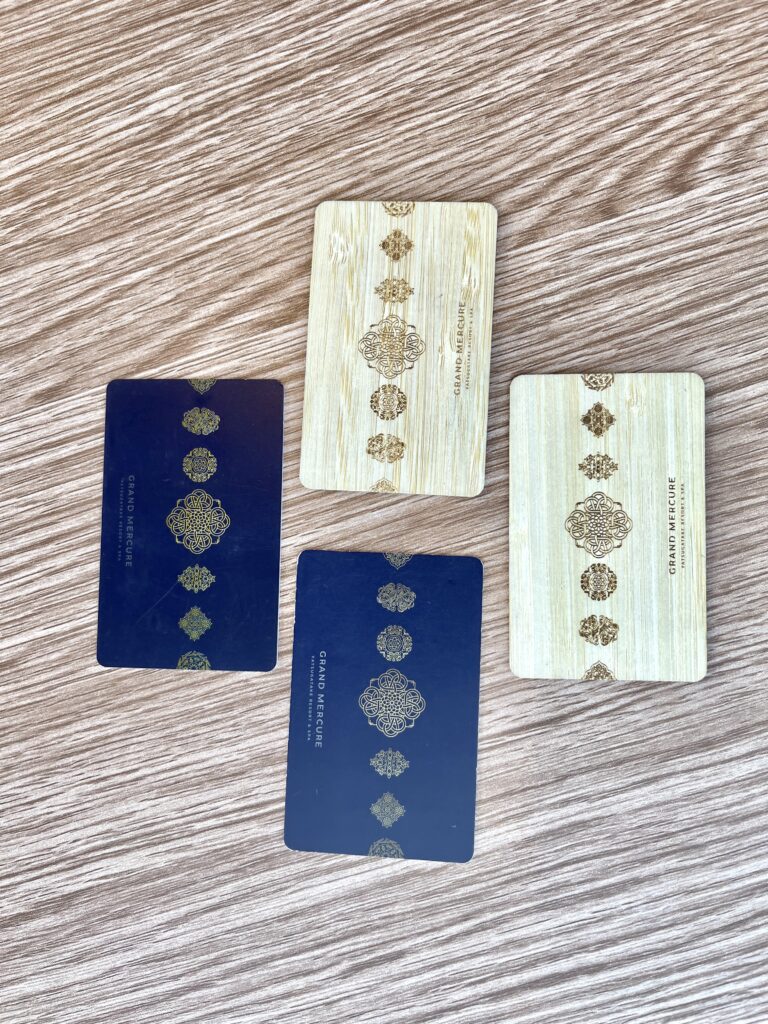 今回はエグゼクティブラウンジを利用可能なお部屋だったので、お部屋用の「紺色のカード」とエグゼクティブラウンジ用の「竹製の特別仕様カード」の2種類をもらいました。