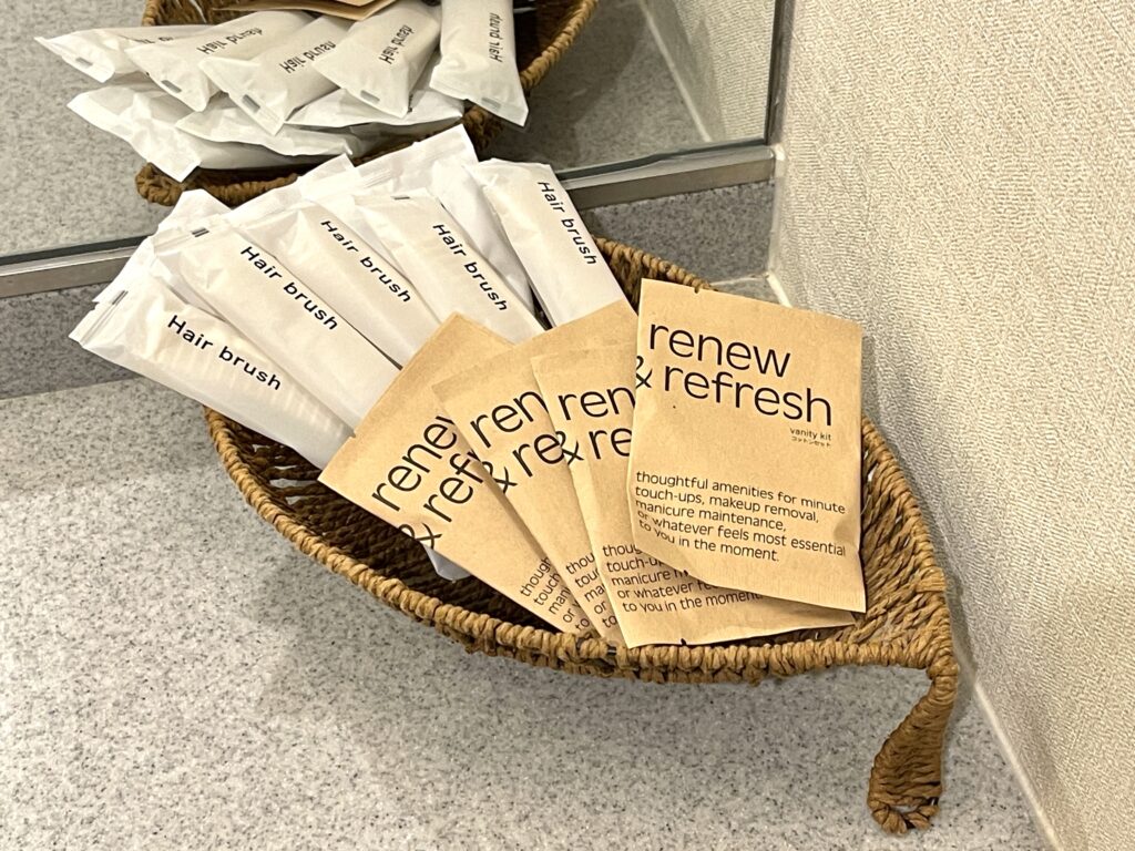 上の木箱には「コットンセット」「シェーバー」「コーム」が置いてありました。