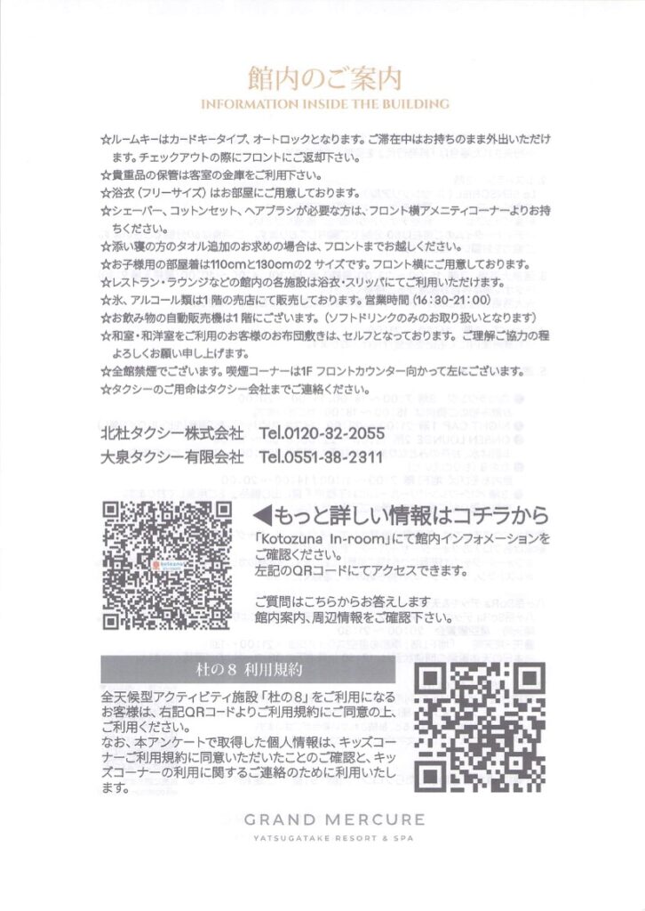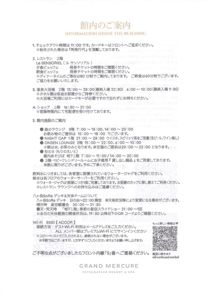 館内のご案内という用紙をもらえました。