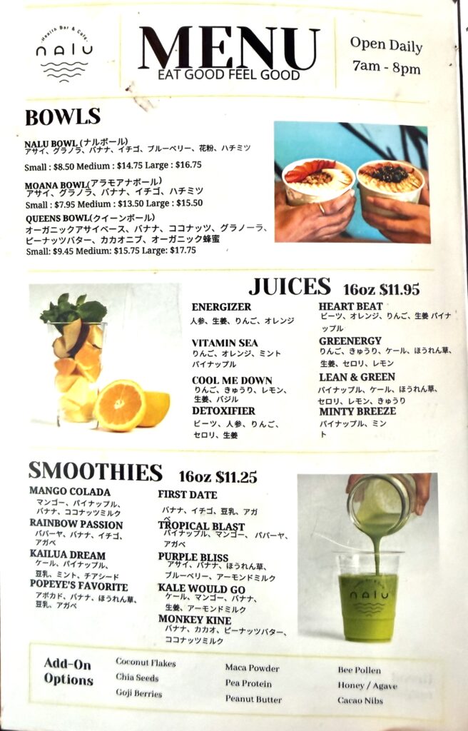 ワイキキでアサイーボウルを探しているときに、SNSで何度も目に入ってきたのが、Nalu Health Bar & Cafe(ナル ヘルスバー&カフェ)。