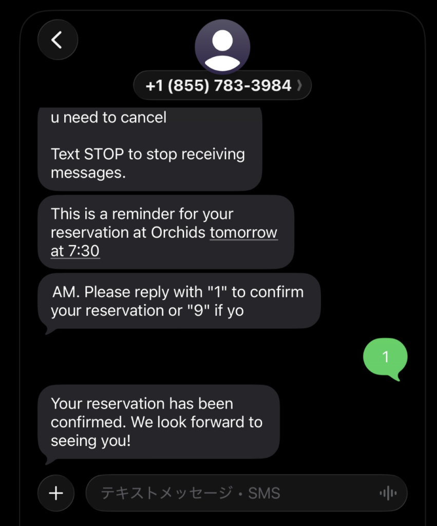 予約前日にSMS(ショートメッセージサービス)でリマインダーが送られてくるので「1」を押して確定させます。