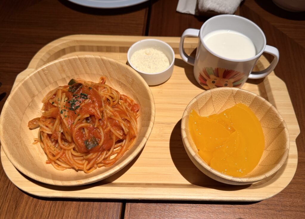 オーガニックトマトソーススパゲティ、パルメザンチーズ、フルーツゼリー
