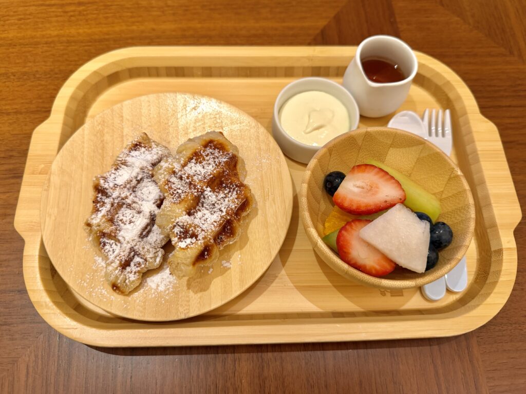 クロワッサンワッフル、メープルシロップ、ホイップクリーム、フルーツ