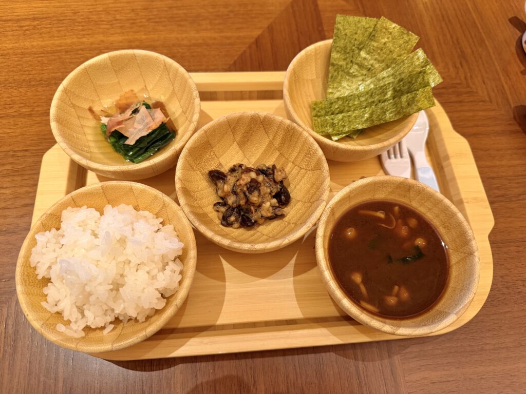 納豆、海苔、野菜のお浸し、白米、赤出汁
