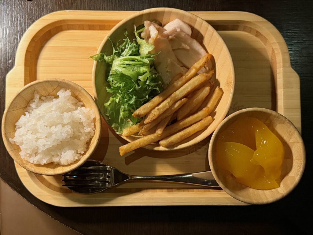 内容は「ごはん」「タンパク質(鶏肉or魚or豆腐)」「野菜」「フルーツ」で、どんな内容かはシェフおまかせとのこと。