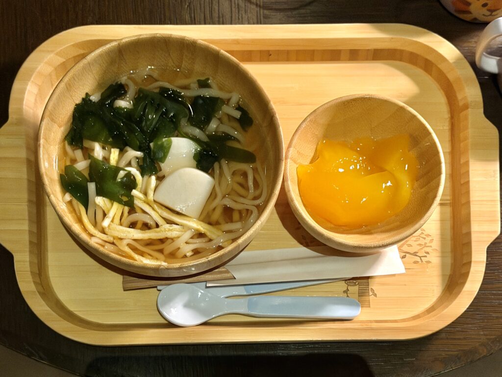 うどん、わかめ、かまぼこ、玉子、フルーツゼリー