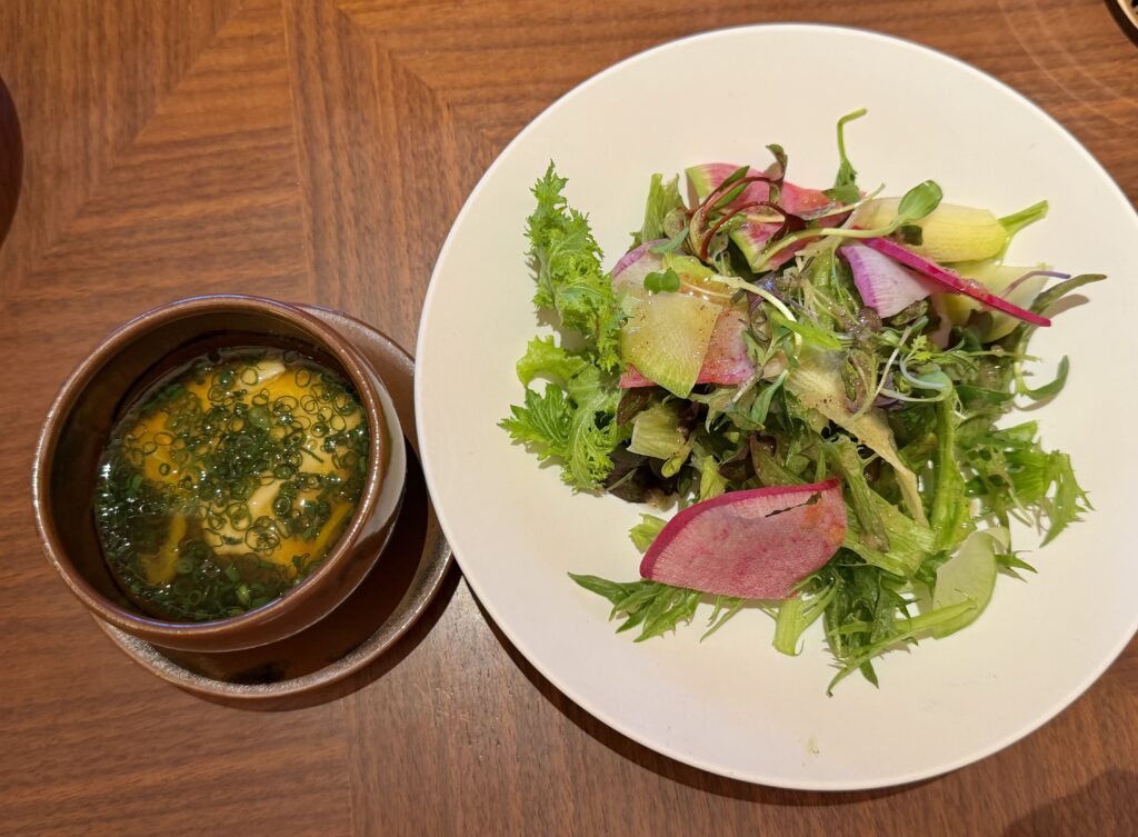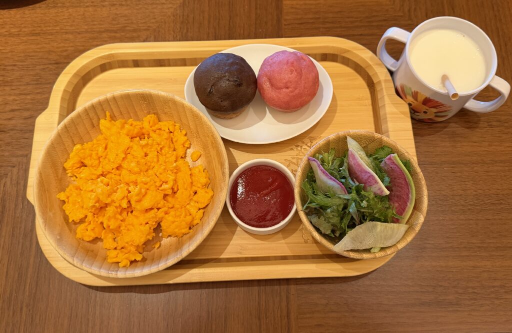 スクランブルエッグと海老原ファームの野菜サラダ、パン2種