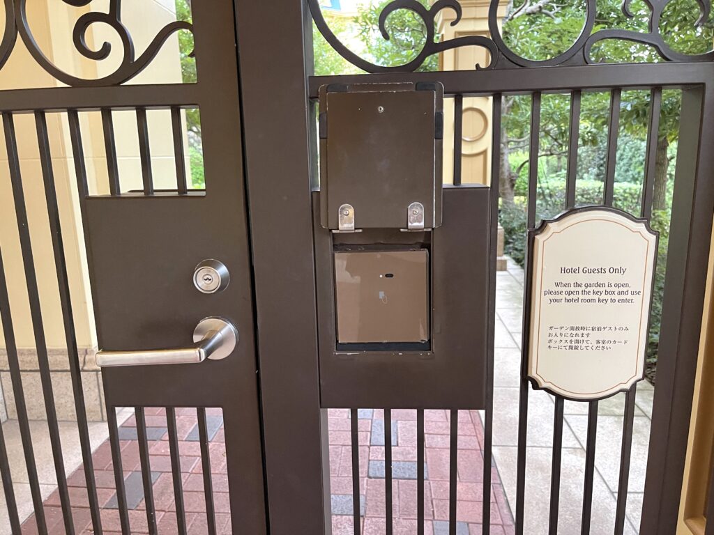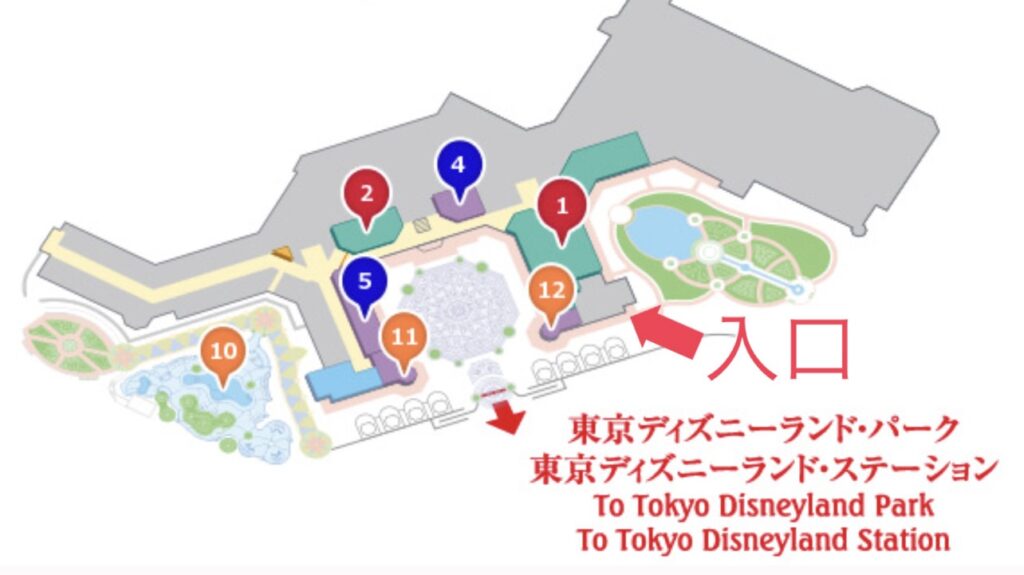 ディズニーランド側のホテルエントランスを出て、ホテルに沿って左回りですすんでいくと、この入り口にたどり着きます。