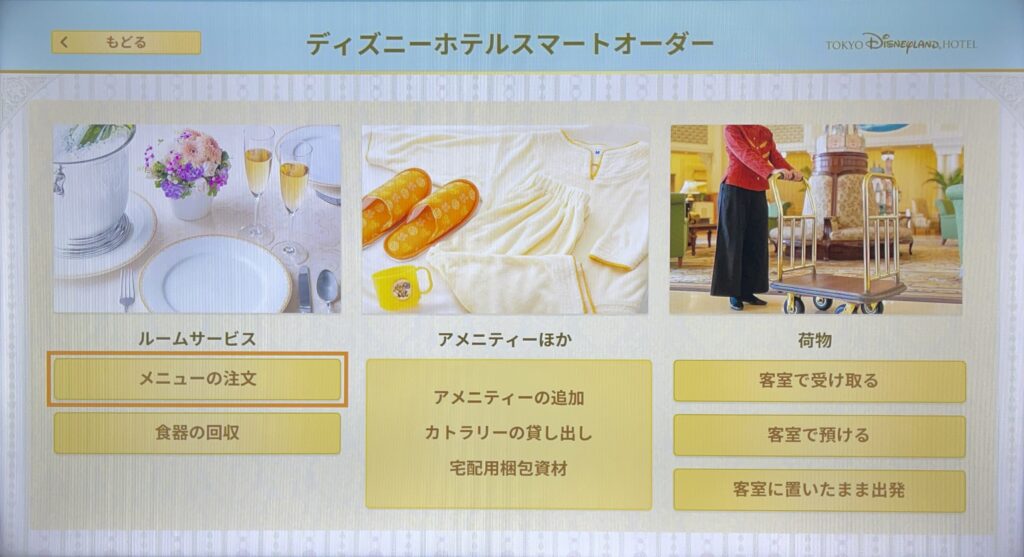 *ルームサービスは、スイートルームおよびコンシェルジュ ディズニーシンデレラルーム、コンシェルジュ デラックスルーム(パークビュー)、コンシェルジュ バルコニールーム(パークグランドビュー)、コンシェルジュ バルコニーアルコーヴルーム(パークグランドビュー)の部屋のみ選択可